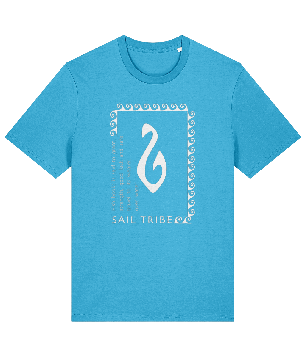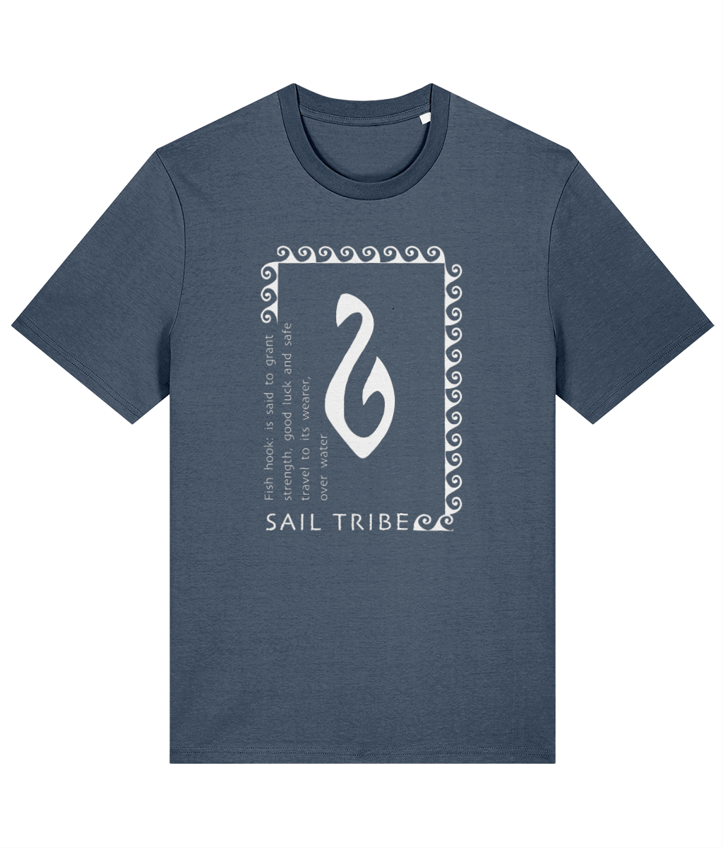 The fishhook in Polynesian and Maori cultures grants the bearer safety over water, and this cool design also incorporates the symbol for water. These symbols are often seen in tribal tattoos. This is a great Tee to wear both onboard and shoreside. Medium fit for men, relaxed fit for women