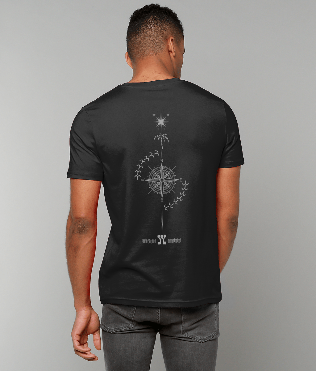 Unique "North Star" Graphics on this organic cotton T Shirt is a representation of one of the most important navigational stars to ancient sailors . The design also includes Maori symbols for people, water, safe return to home.